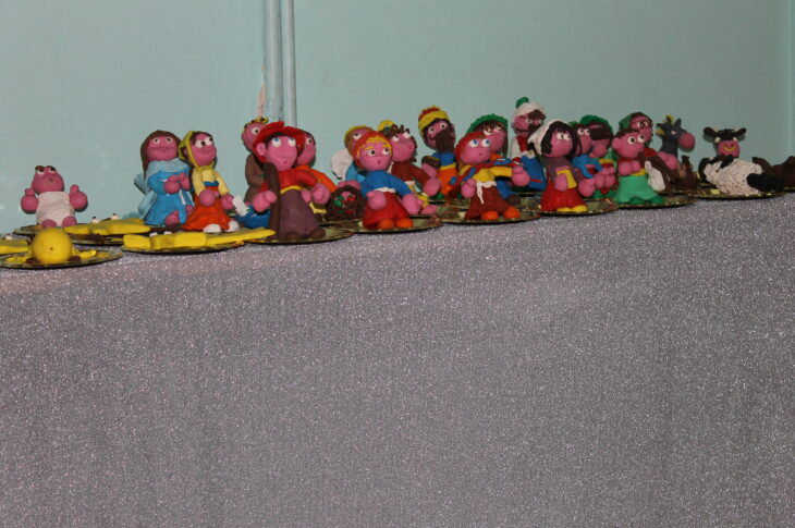 bambini e le insegnanti diventano Maria, Giuseppe, Gesù Bambino, i pastori, le pecore, i re magi, le contadine e lavandaie, la stella cometa, la luna, le stelle,